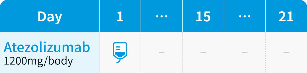 成人はアテゾリズマブ1200mgを3週毎に点滴静注、 12歳以上の小児は15mg/kg (最大1200mg) を3週毎に点滴静注
