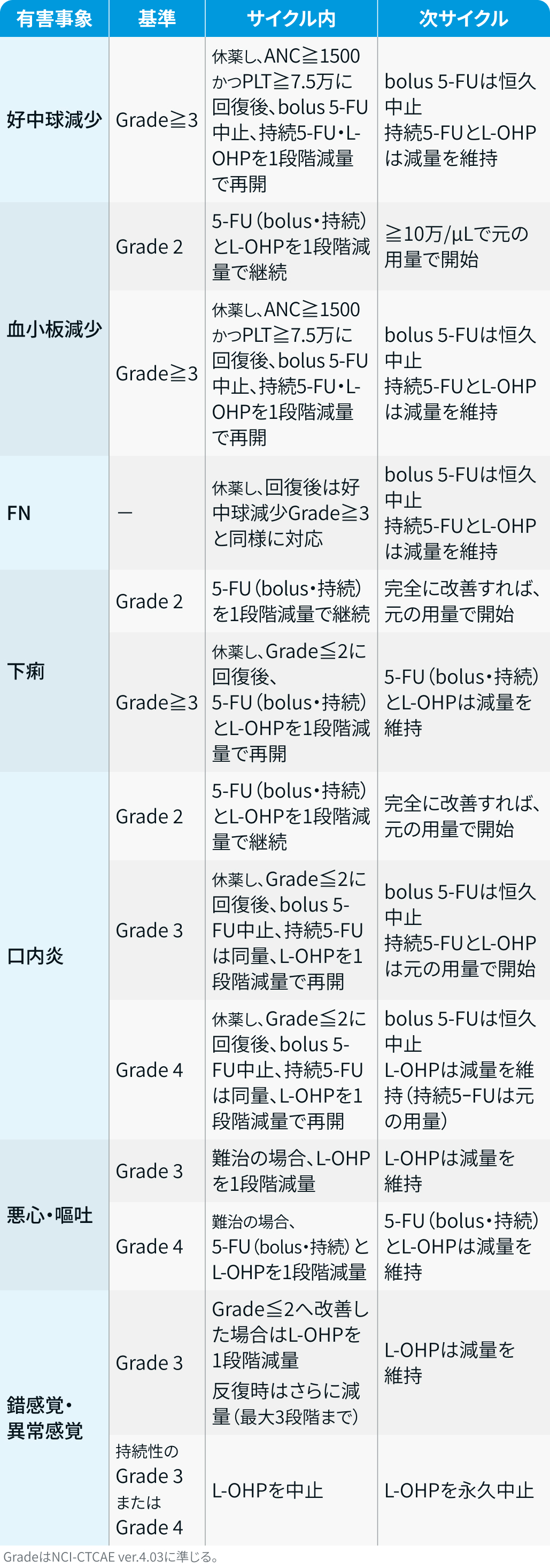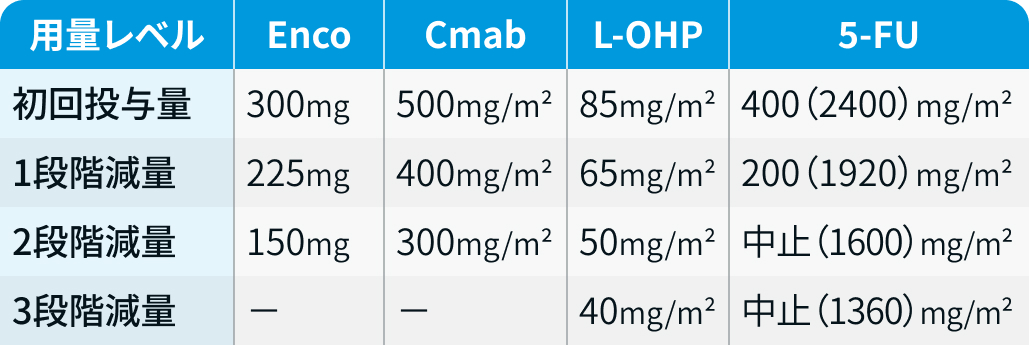 L-OHP : CrCL<30mL/minは、 初期投与量85mg/m²を65mg/m²に減量 (CrCL≧20mL/minでは減量不要との報告もある)⁴⁾。