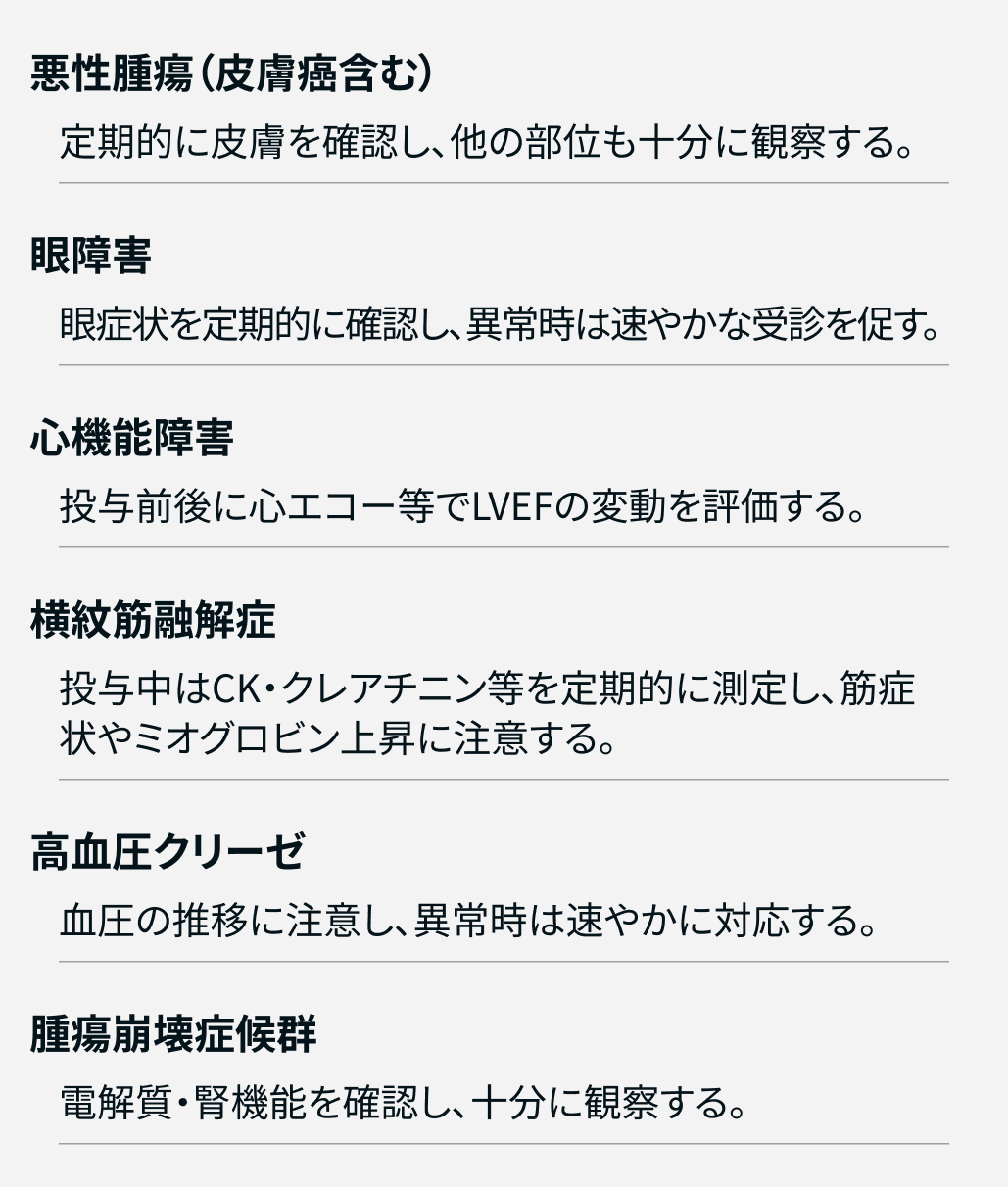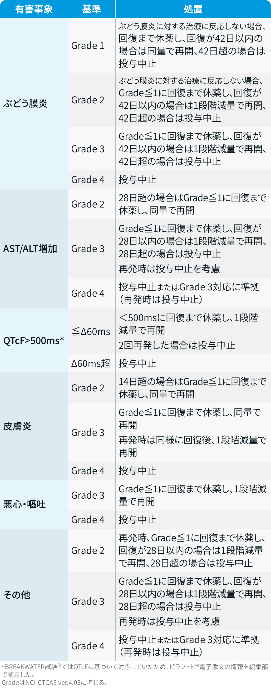 BREAKWATER試験³⁾では、 間質性肺炎はGrade 2または増悪でCmabを休薬しGrade≦1で再開、 Grade 3では鑑別確定まで休薬し、 間質性肺疾患が確認されれば永久中止とされた。