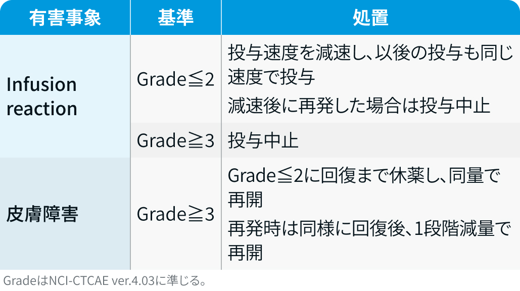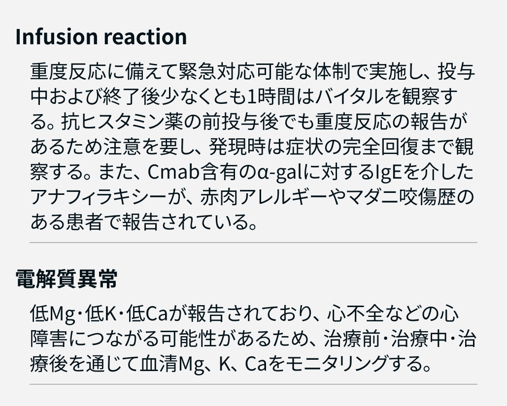 | Cmab投与時に生じ得るインフュージョンリアクションを軽減するため、投与前に抗ヒスタミン薬を前投与し、必要に応じて副腎皮質ステロイドを併用する。 |