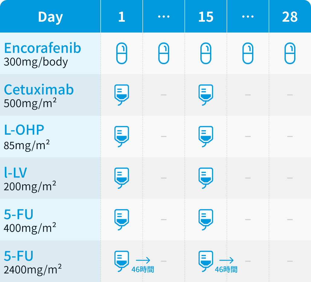 本レジメンは、 BRAF V600E変異陽性進行・再発結腸直腸癌の1次治療として適用される。