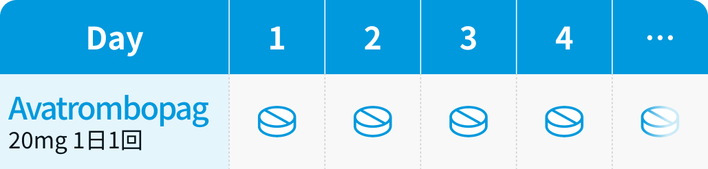 通常、 成人にはアバトロンボパグ20mgを1日1回食後に開始し、 血小板数や症状に応じて投与量を適宜調節する。