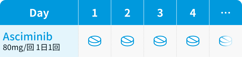 従来はASCEMBL試験⁴⁾を根拠に3次治療以降で使用されてきたが、 2025年5月19日、 ASC4FIRST試験の結果を踏まえ、 未治療患者に対しても1次治療から使用可能となった。