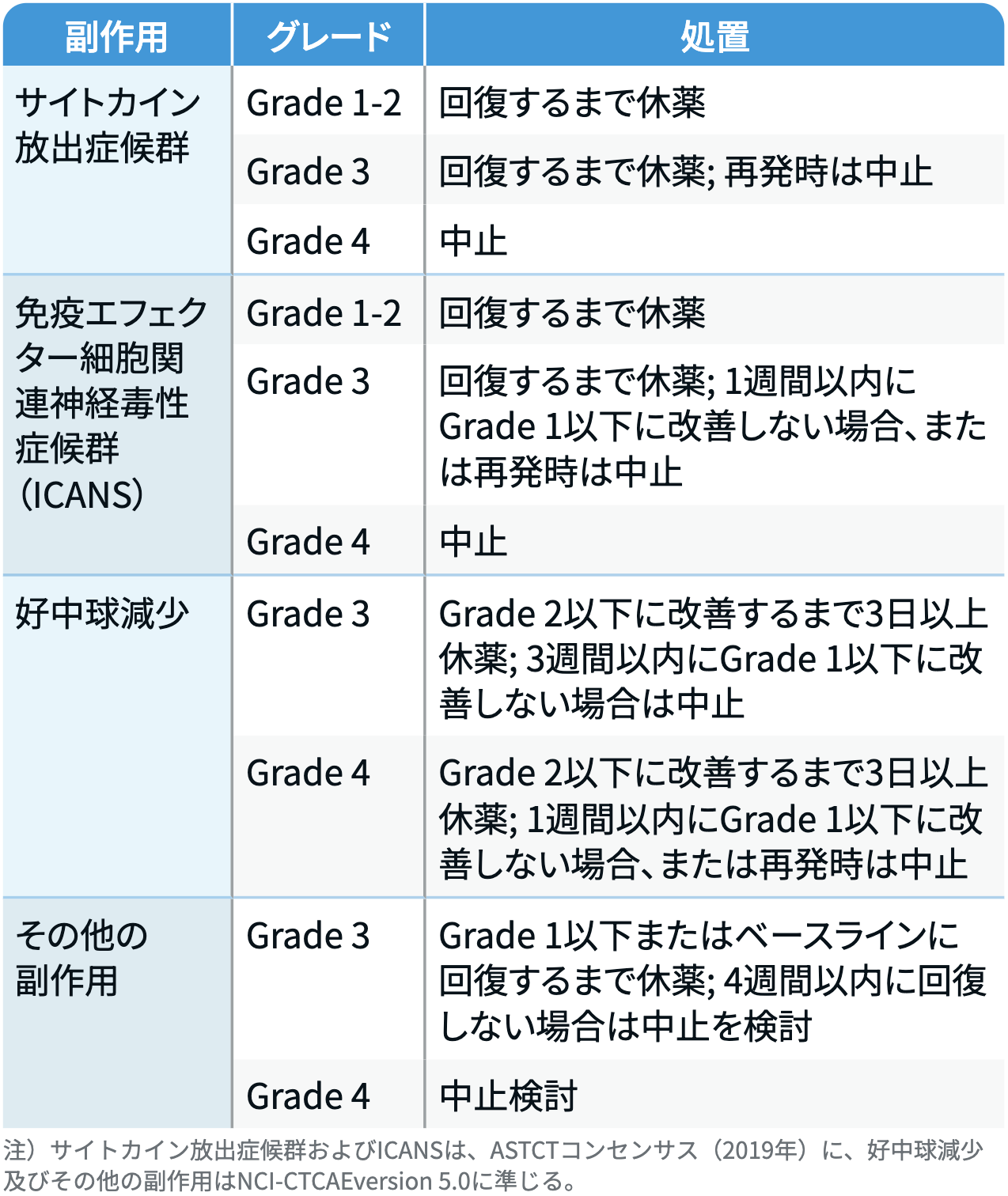 初回投与後および増量時に、 免疫エフェクター細胞関連神経毒性症候群 (ICANS) や サイトカイン放出症候群 (CRS) などの免疫関連AEが高頻度に出現するため、 最適使用推進ガイドライン等を参考に『厳密な副作用モニタリングと管理が可能な環境』で行うという点が非常に重要。