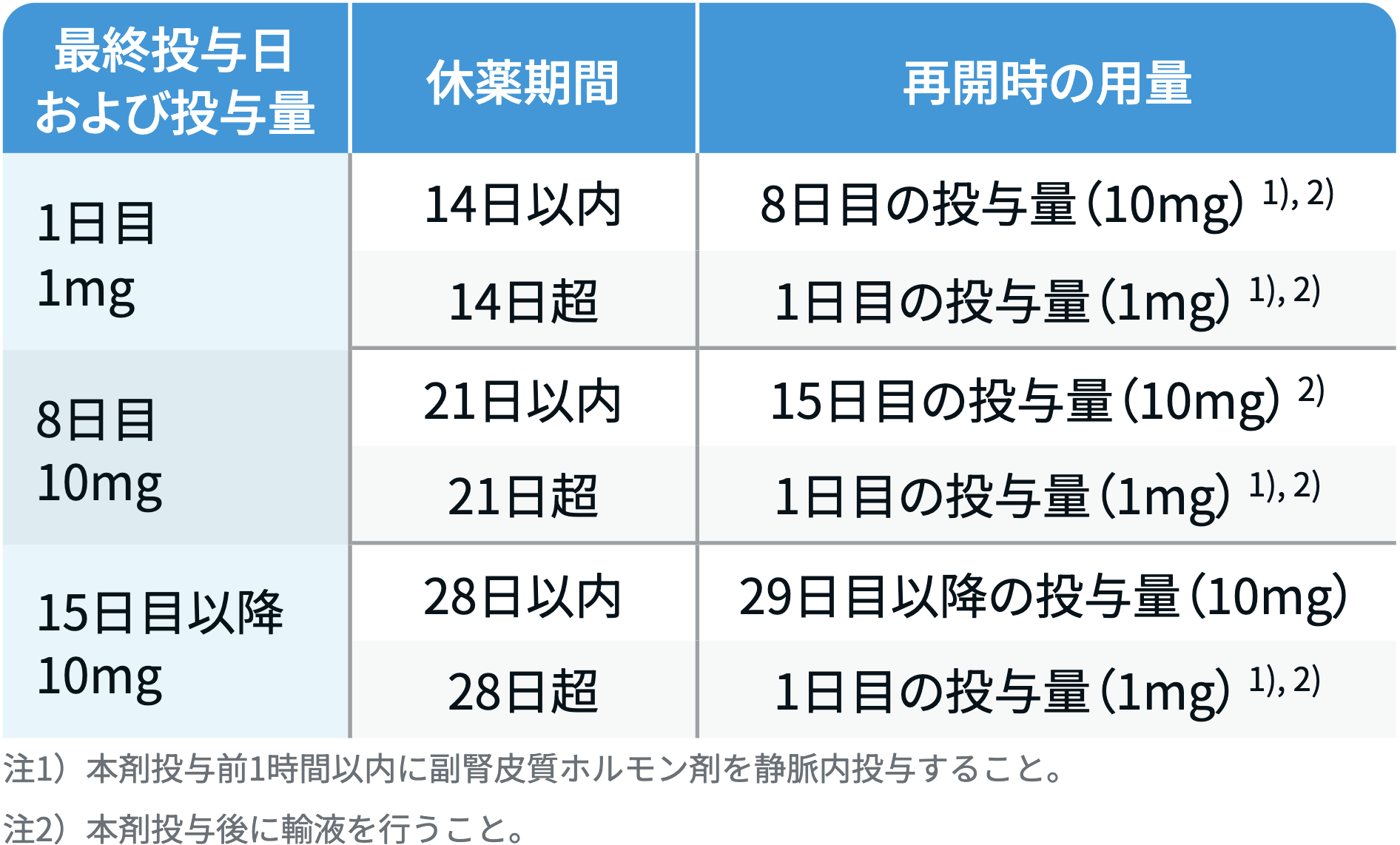 1サイクル28日間で、 1サイクル目のDay1に1mgを、 その後Day8とDay15に10mgを、 2サイクル目以降は病勢進行または許容できない毒性が認められるまで2週間ごと (Day1とDay15) に1時間かけて静脈投与する