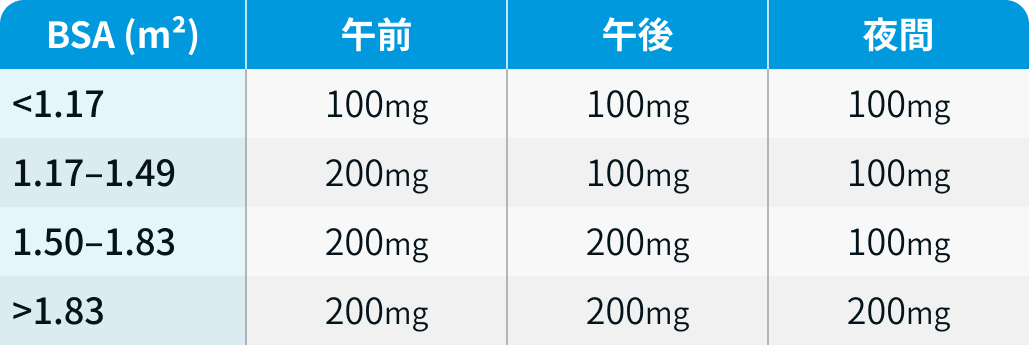 UFT : 下表を参考に、 300mg/m²/日を1日3回 (約8時間ごと)、 食前後1時間を避けて内服