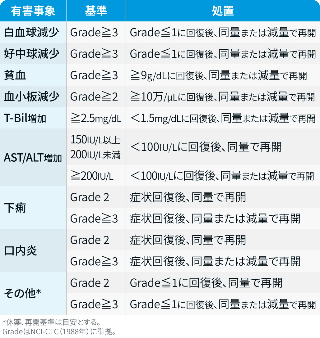 有害事象時にUFTを減量または休薬する基準は下記のとおり (処置欄には休薬時の対応を示す)。