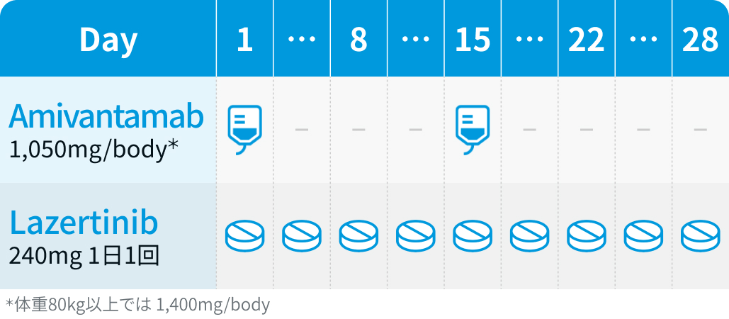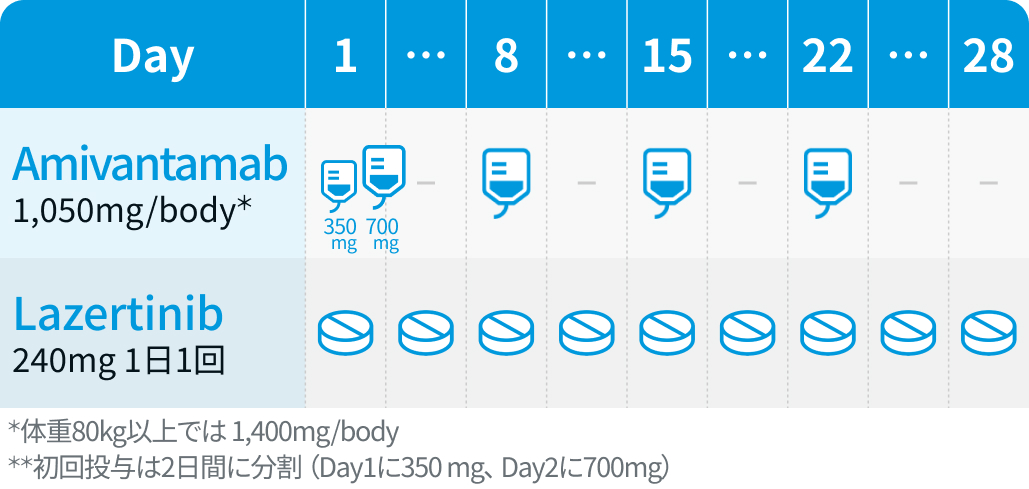 アミバンタマブ : 80kg未満では1回あたり1,050 mg、 80kg以上では1,400mg投与 (なお、初回のみ体重問わずDay1 350mg、 Day 2 残量の分割投与とする)。 1サイクル目は週1回投与とし、 2サイクル目以降は2週間に1回継続投与する。