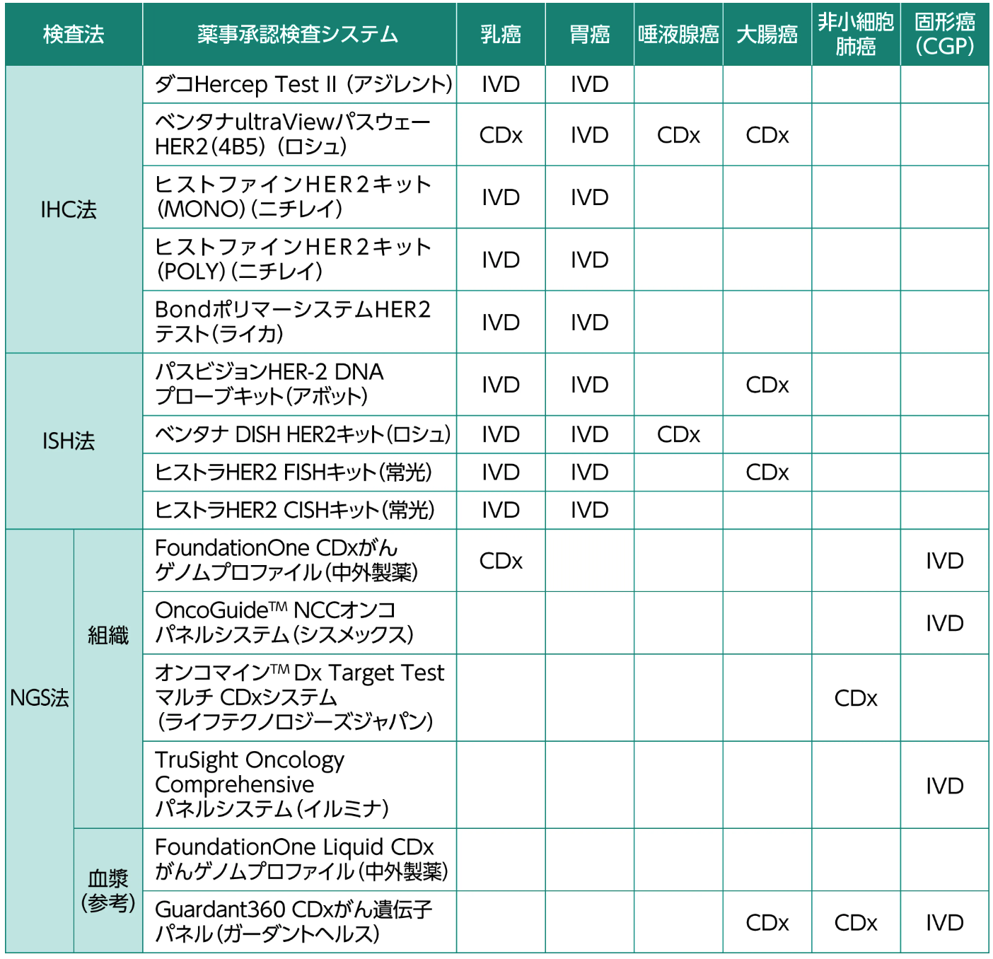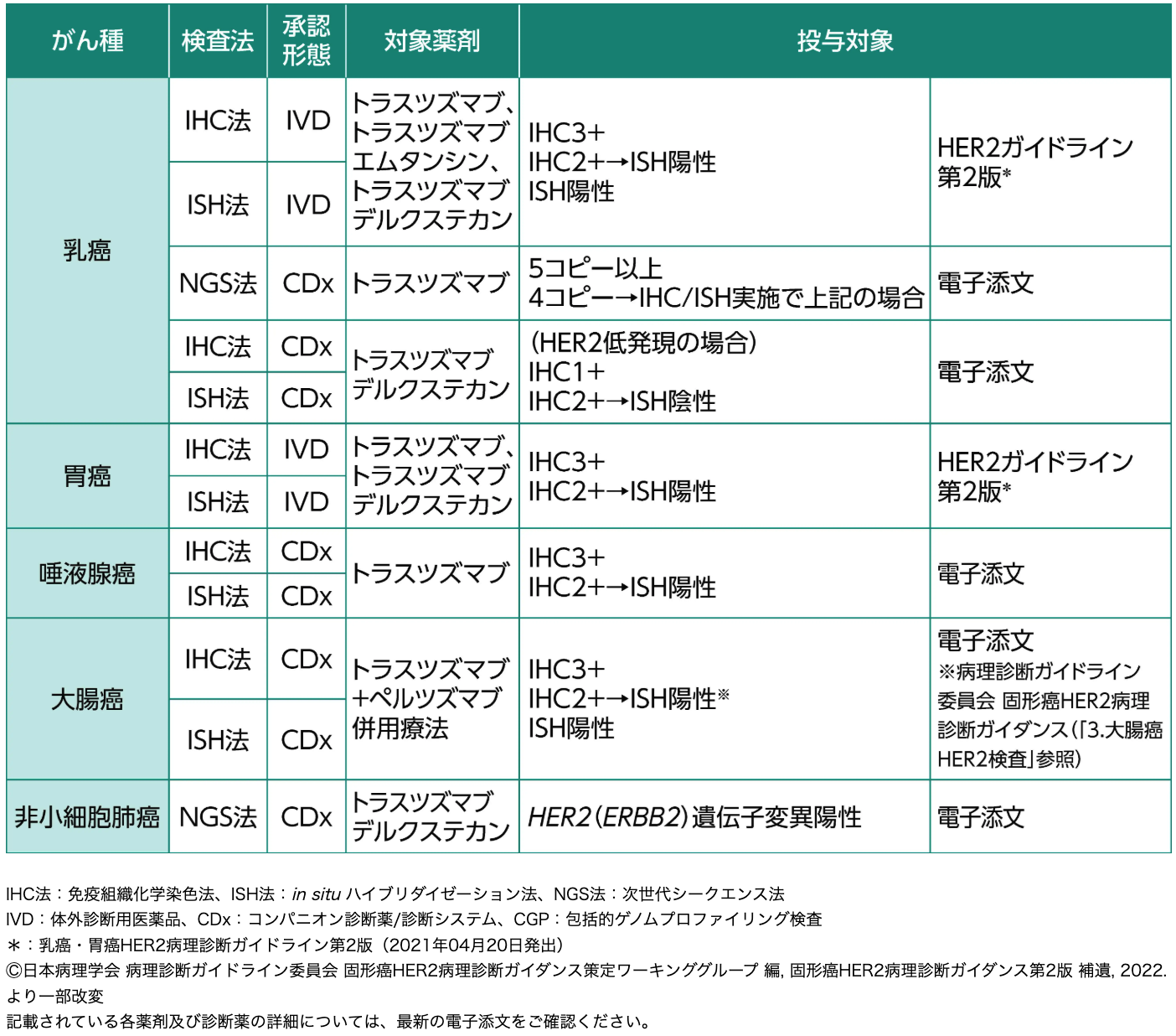 HER2検査には、 HER2タンパク過剰発現を検出する免疫組織化学 (IHC) 法や、 HER2遺伝子増幅を測定するin situ ハイブリダイゼーション (ISH) 法が臨床で使用されており¹⁾²⁾、 次世代シークエンス (NGS) 法によっても検出可能である¹⁾。 現在、 日本で承認されているHER2検査と、 がん種別の判定基準を下表に示した³⁾。