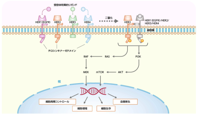 Human epidermal growth factor receptor type2 (HER2) はがん遺伝子であるHER2遺伝子によってコードされるタンパク質で、 増殖因子受容体群HERファミリーに属している¹⁾。 HERファミリーは細胞膜を貫通する受容体型チロシンキナーゼであり、 二量体を形成してRAS/RAF/MEK/MAPK経路やPI3キナーゼ (PI3K) /AKT経路の細胞内シグナル伝達を活性化し、 細胞増殖などが促進する²⁾。