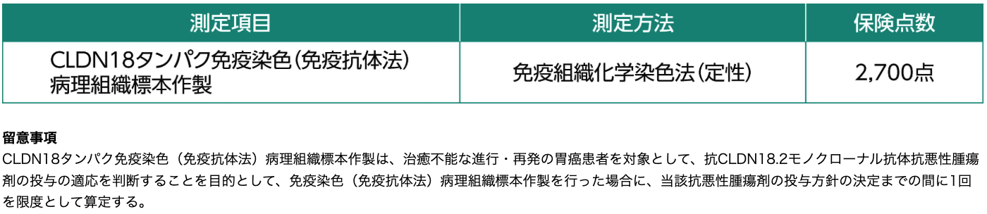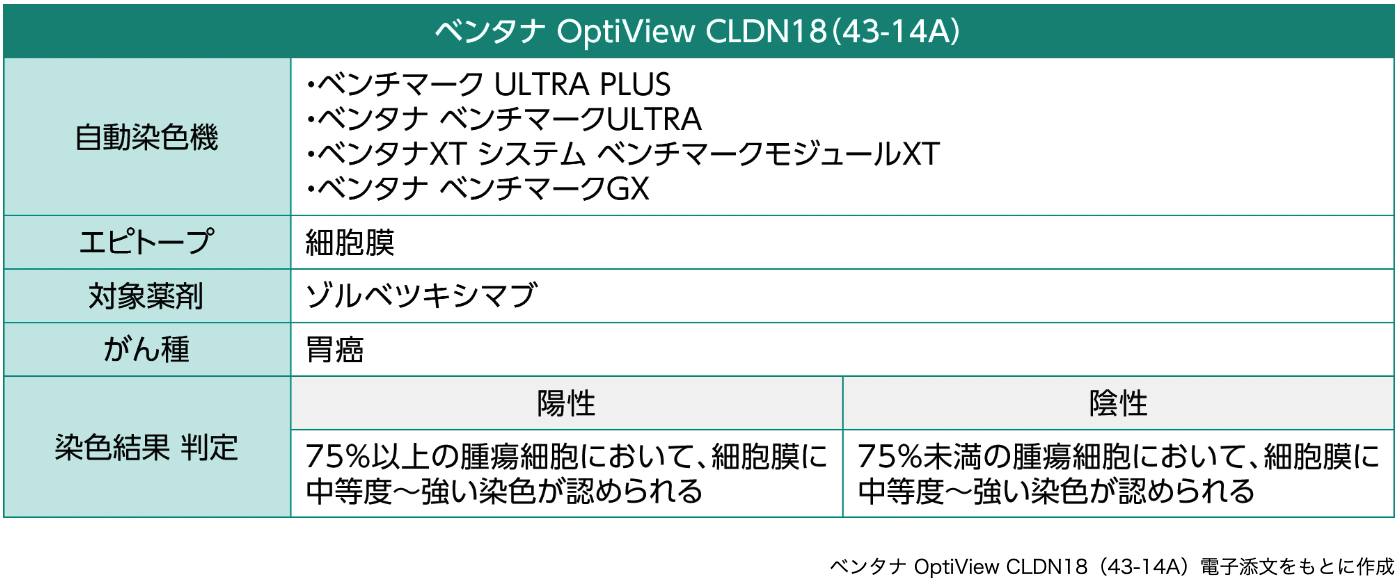 現在日本で承認されているのは、 コンパニオン診断薬であるベンタナOptiView CLDN18 (43-14A) である。 本検査ではCLDN18.1とCLDN18.2の両方を認識するが、 正常胃粘膜や胃癌におけるCLDN18.1発現は極めて低いため、 検査結果をCLDN18.2の発現とみなす。