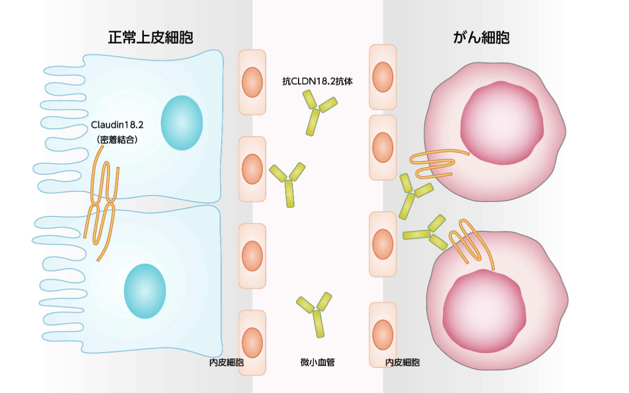 CLDNには27のアイソフォームが同定されており¹⁾、 CLDN18.1は肺胞上皮細胞に、 CLDN18.2は胃粘膜上皮細胞に発現している¹⁾。 CLDN18.2は腫瘍細胞の増殖、 分化、 転移に関与しているとの報告もある⁴⁾。