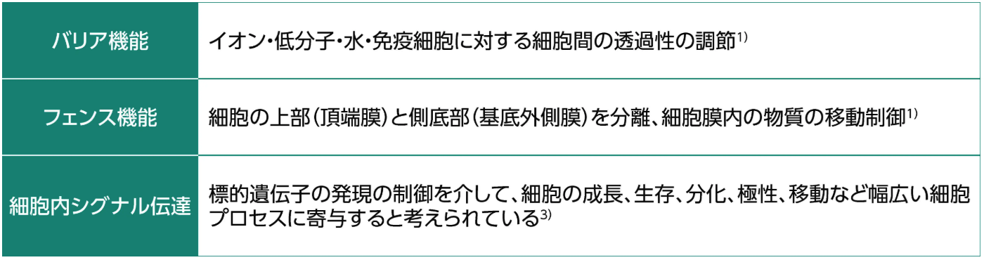 Claudin (CLDN) は細胞間接着のひとつであるタイトジャンクション (密着結合) 形成に関わる細胞膜4回貫通型タンパク質であり¹⁾、 以下の機能により (特に胃において) 細胞間の透過性の調整機能などに関わっている¹⁾²⁾。
