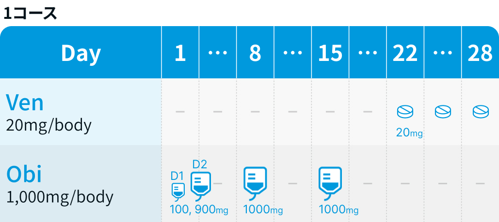 Obi : 1コースでは1日目100mg、 2日目900mg、 8日目と15日目に各1000mgを投与し、 2コース以降は各コース1日目に1000mgを投与して、 28日ごとに計6サイクル投与²⁾