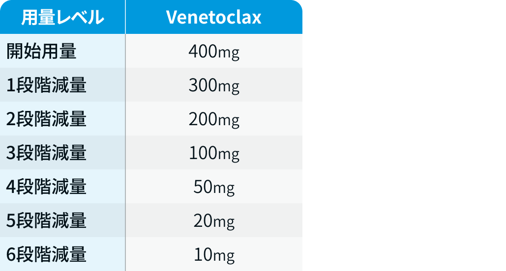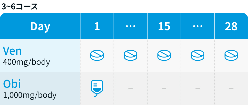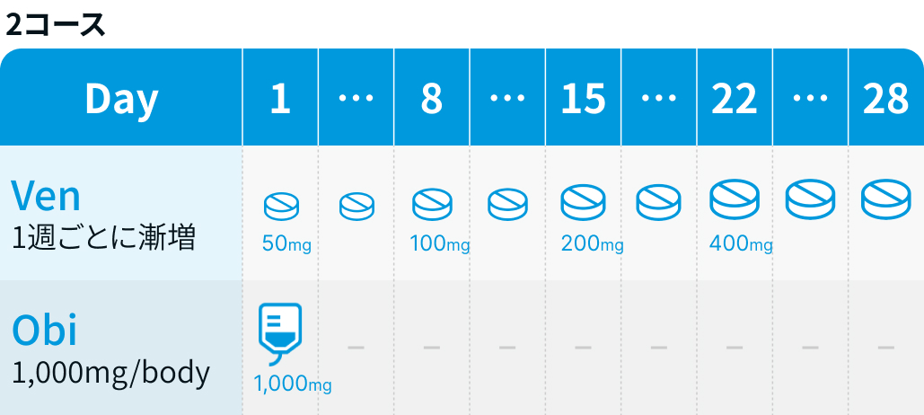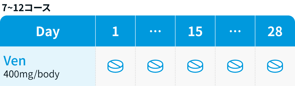 Ven : 1コース22日目から5週間の用量漸増を開始し、 2コース28日目に漸増を完了した後、 3コース1日目から12コース最終日まで28日ごとに投与²⁾