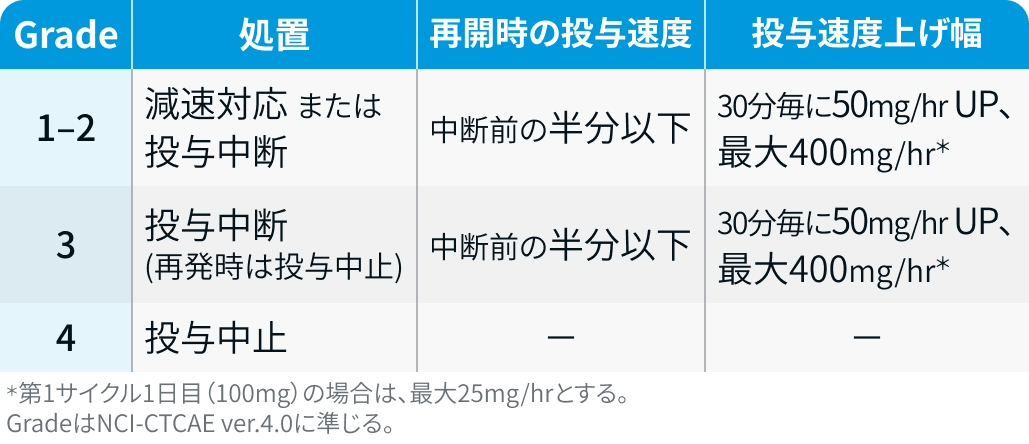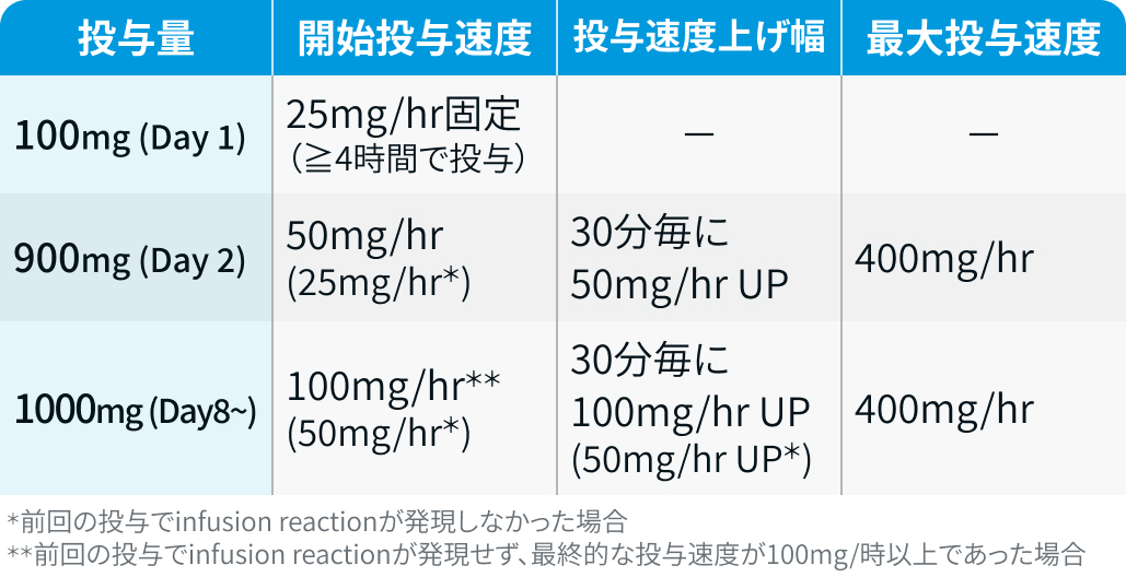 Obi投与の30分~1時間前に抗ヒスタミン薬と解熱鎮痛薬を前投与する。 また、 ステロイドの前投与を考慮する。 さらに、 infusion reaction予防のため下表に従って投与速度を管理する。